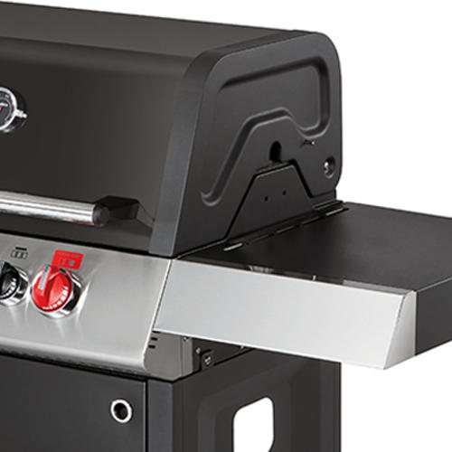 MATÉRIAUX ROBUSTES Panneaux latéraux de grande qualité en fonte d’aluminium sur le couvercle et la chambre de combustion ; Couvercle émaillé double paroi avec thermomètre intégré ; 2 tablettes latérales rabattable pour un stockage compact ; Panneau de commande en inox et portes à double paroi en acier