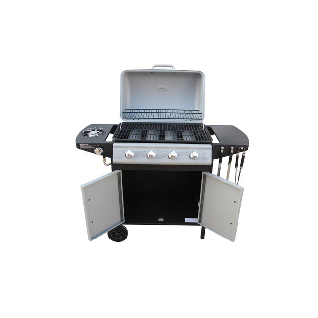 Description – Barbecues gaz – Concept Usine – Branson – Barbecue à gaz 4 brûleurs + ustensiles inclus