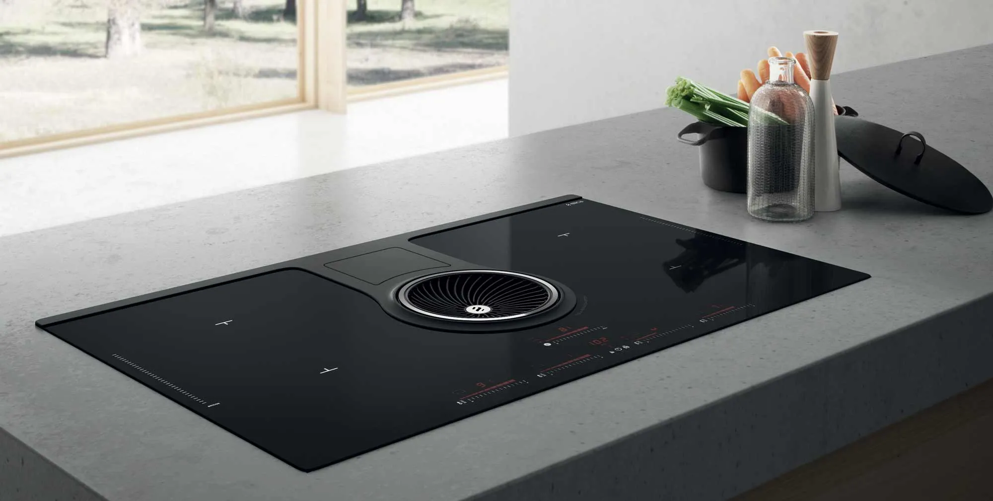 La surface en vitrocéramique noire intègre une aspiration centrale qui évacue les fumées à la source, limitant les odeurs et la buée autour des casseroles. Avec