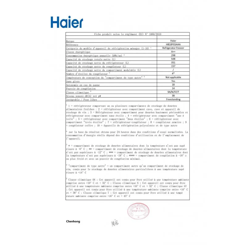 - Classe climatique : SN-T (10 °C à 43 °C)